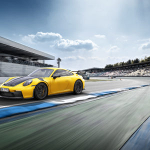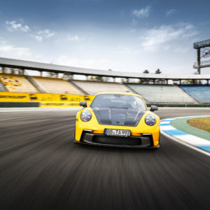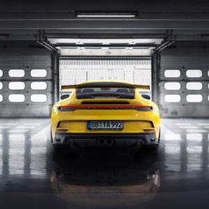 With the eye-catching aerodynamic parts made of genuine carbon fiber, TECHART clearly highlights the racing DNA of the Porsche 911 GT3 and 911 GT3 with Touring Package, while retaining the aerodynamic concept of the sports car. The 15 millimeter wider TECHART lightweight fenders with wheel arch louvers and the carbon aero lid ensure an impressive appearance in the rear-view mirror. Largely dimensioned air inlets at the front, a prominent front spoiler lip and air inlet panel in the front apron, sports side mirrors and side skirts as well as the lower part of the rear apron – all made of high-quality TECHART visible carbon – replace the standard components. The TECHART upgraded 911 GT3 also features a rear wing made entirely of carbon fiber with powerfully shaped wing end plates and a carbon air intake panel on the trunk lid.